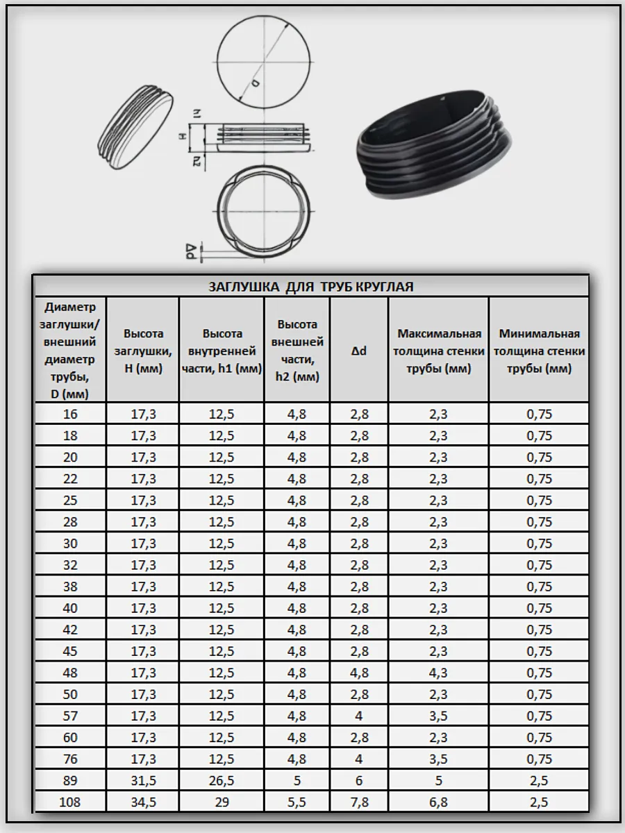 | Заглушка для труб круглая d 16 мм черная, 50 шт. | 26-0010ф50 | 1 шт. |