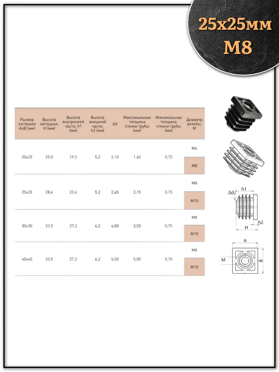 | Заглушка для труб квадратная 25х25 мм с резьбой М8, 2 шт. | 32-0110ф2 | 1 шт. |