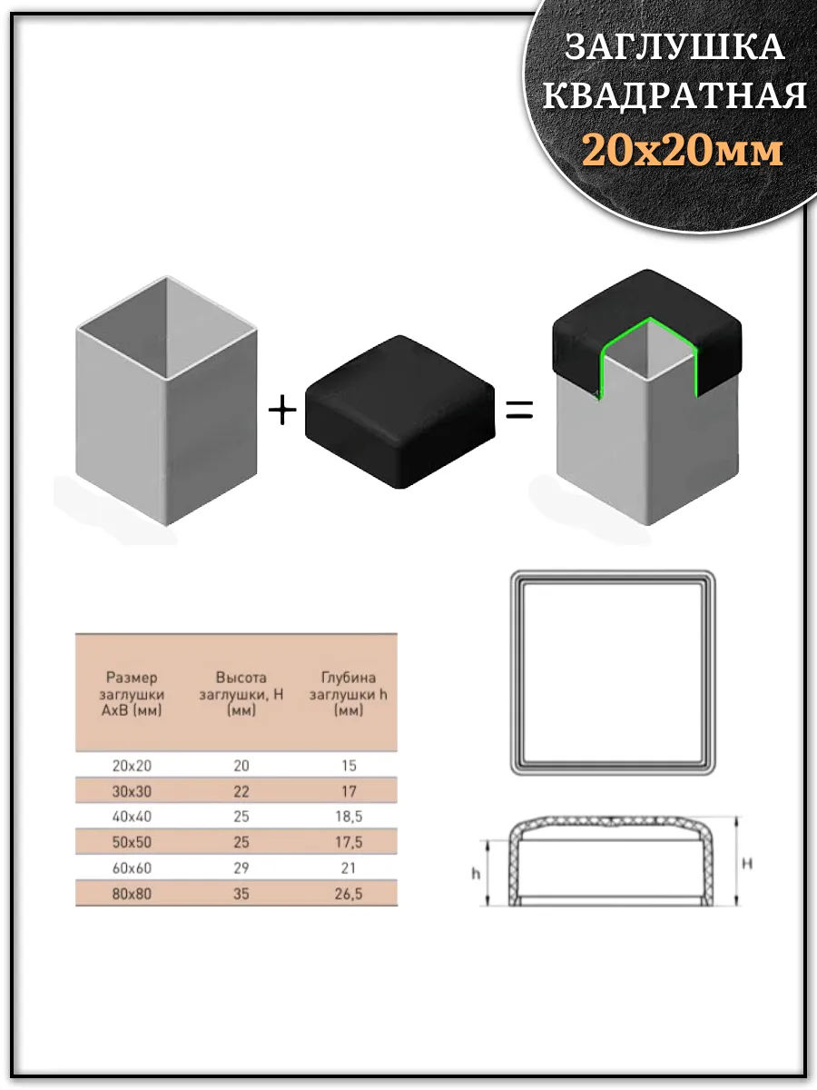 | Заглушка для труб наружная квадратная 20х20 мм черная,20 шт. | 26-3020ф20 | 1 шт. |