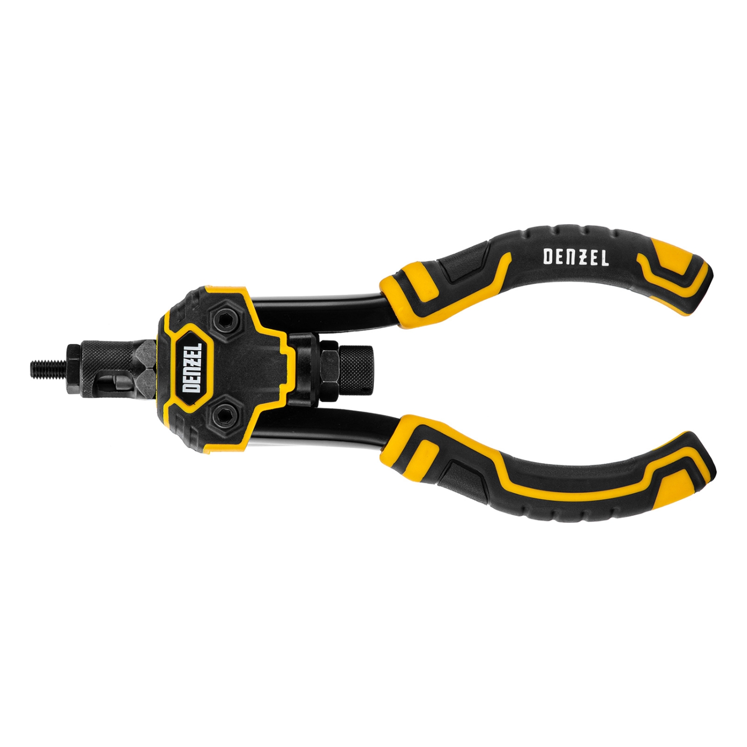 Заклепочник двуручный Denzel 40500 длиной 250 мм предназначен для работы с алюминиевыми и стальными заклепками диаметром 2,4-6,4 мм и 2,4-4,8 мм соответственно. Используется для прочного соединения листовых металлических заготовок, легких конструкций небольшой толщины и металлопрофилей. Двуручный заклепочник требует меньше усилий от пользователя для вытягивания шпильки, поэтому подходит для профессионального применения и выполнения больших объемов работ.