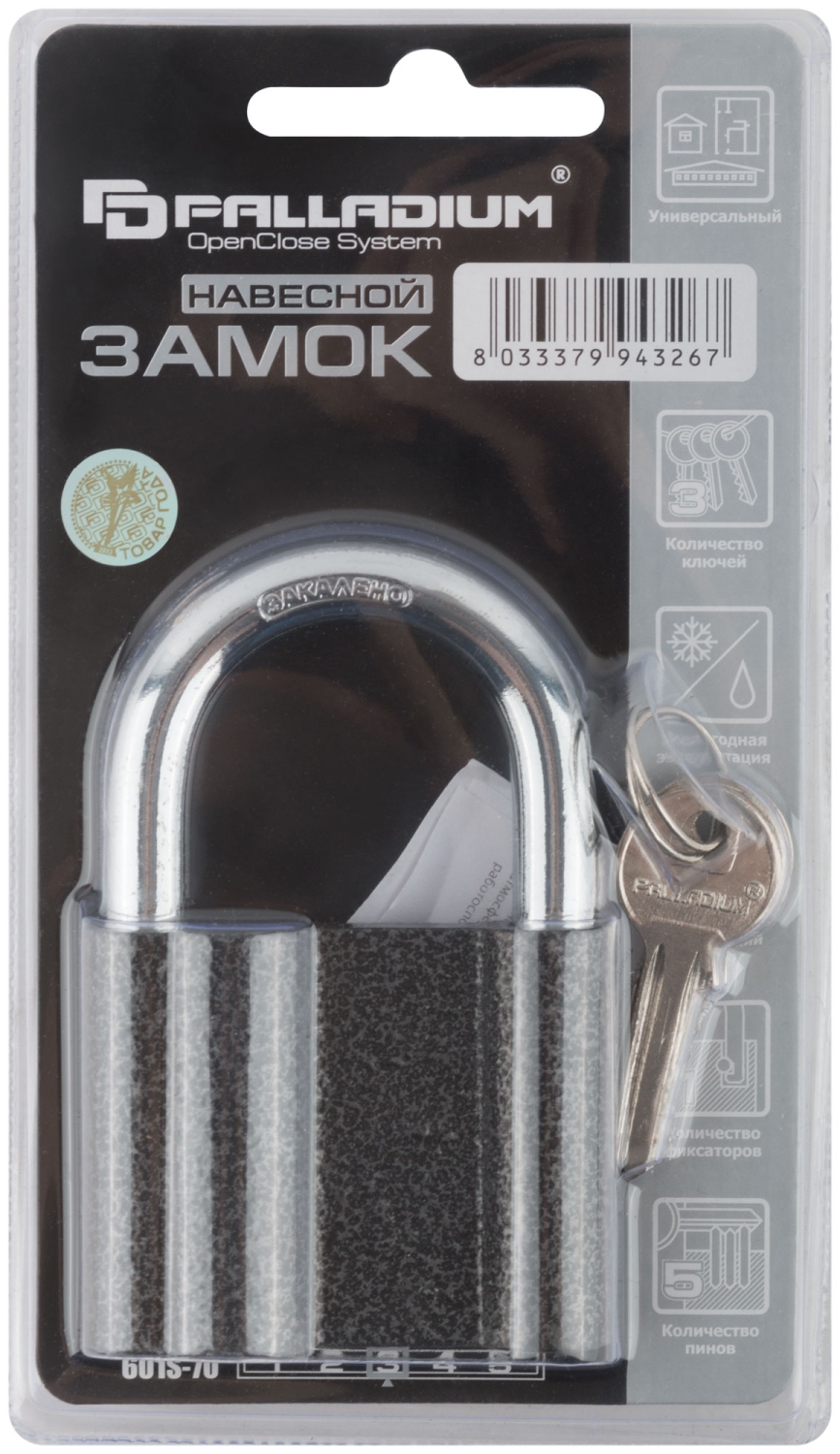 Замок навесной стальной корпус PALLADIUM (601S) 70х54 мм стальная дужка 11 мм (00009302)