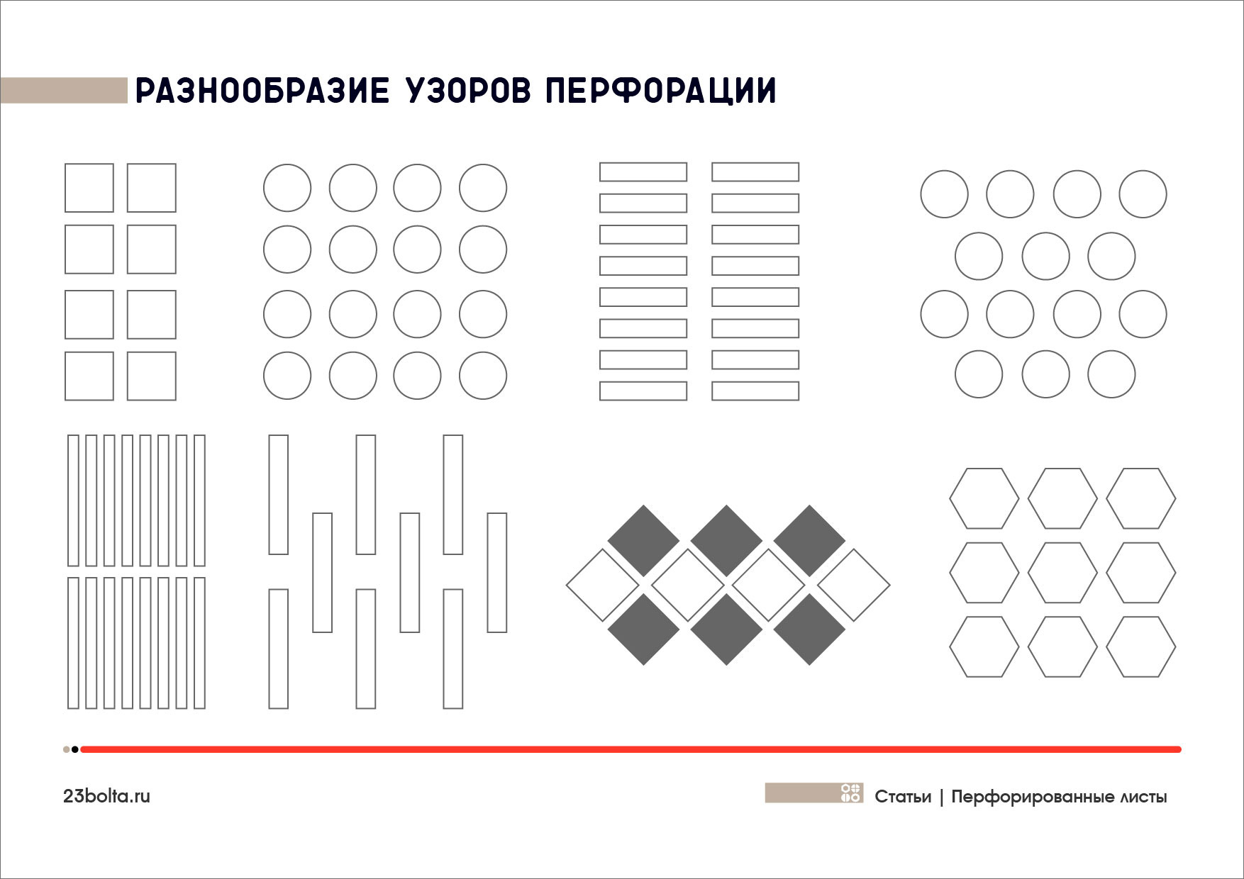 Допускается прямоугольная или квадратная, круглая, шестигранная форма перфорации, однако с развитием технологических процессов, возможна индивидуальная разработка.